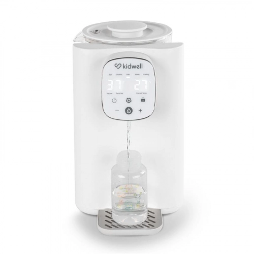 Kidwell PIIM ir uzticams palīgs vecākiem ar dažāda vecuma bērniem. Precīzs termostats ļauj regulēt temperatūru ar 1° precizitāti. MILK režīmā ūdens tiek uzsildīts līdz optimālajiem 37°C — ideāli maisījuma pagatavošanai. Ūdens dozēšana ir regulējama 10 ml soļos, un ierīce atceras iestatījumus, padarot nakts barošanu ērtāku. Ūdens izplūdes vieta ir apgaismota ērtībai.