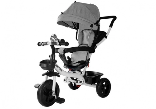 Дизайн велосипеда включает просторную корзину для покупок или игрушек между задними колёсами и маленькую сумку на родительской ручке — эти элементы делают прогулки и поездки максимально удобными. Мягкое пенопластовое ограждение обеспечивает безопасность ребёнка и предотвращает падение из сиденья. Сиденье можно повернуть лицом к родителю и зафиксировать в безопасном положении. На руле также есть звонок-труба, с помощью которого ребёнок сможет сообщить окружающим о своём движении.
